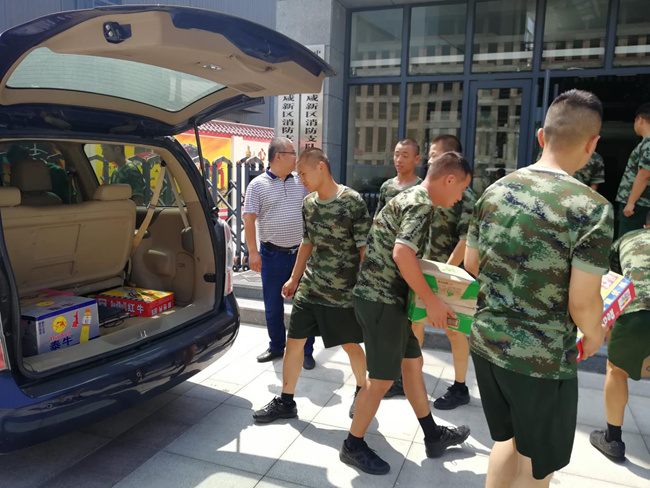 陜西遠景華邦置業(yè)有限公司董事長(cháng)張華委托總經(jīng)理侯智勇及工程師楊浡,帶著(zhù)防暑降溫用品親臨秦漢新城消防大隊,對戰斗訓練在高溫下的消防官兵進(jìn)行慰問(wèn)。受到了官兵的熱烈迎接,進(jìn)一步促進(jìn)了"雙擁"建設,體現了軍民魚(yú)水情。共建"雙擁"模范城的良好氛圍。